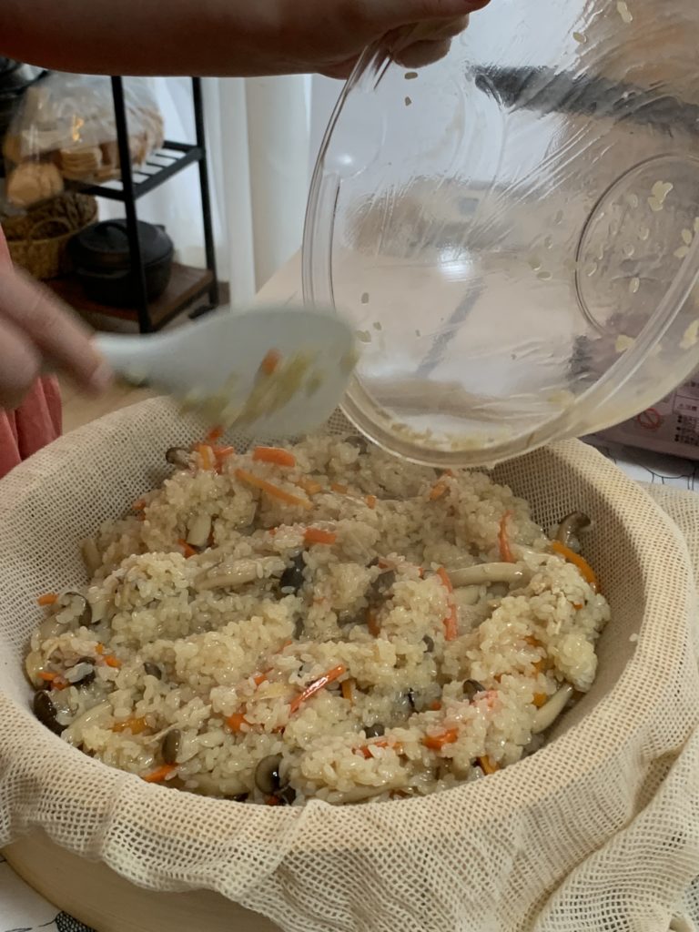 もち米を蒸して具材を作って混ぜて作る五目おこわ鶏と搾菜と一緒に蒸して作る中華おこわ季節によって具材をかえて色んなおこわが作れますよ。